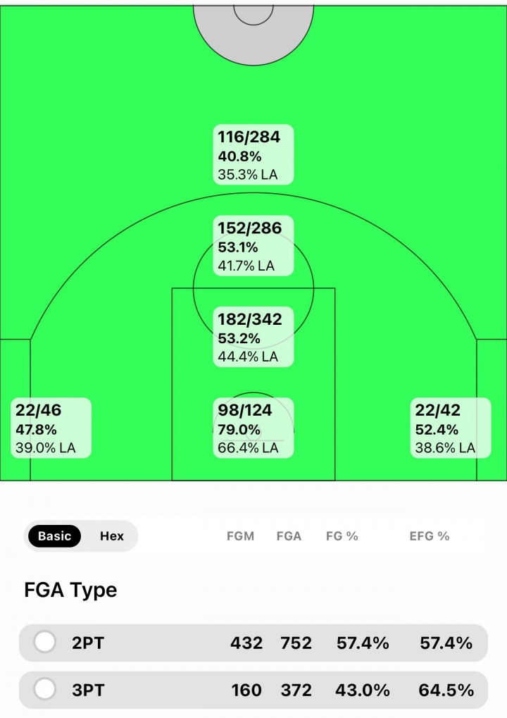 “KD在NBA生涯第18个赛季两分球命中率是57.4%,三分命中率为43%;